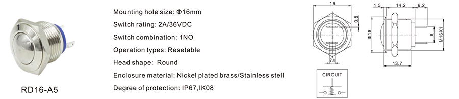 金屬開關 | RD16-D5 | 36VDC | 2A | / | / | ≥100,000 CYCLES | 立即申請 | 下載 |