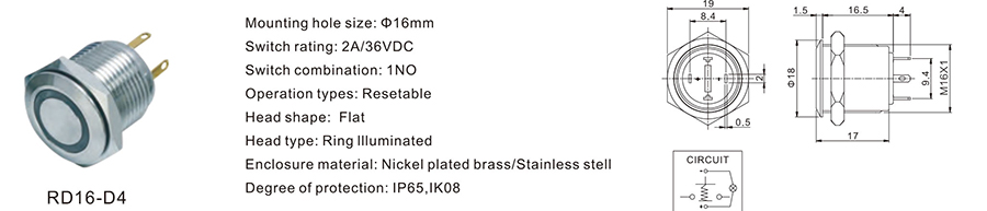 16MM金屬開關RD16-D4 金屬開關 RD16-D4 36VDC 2A / / ≥100,000 CYCLES 立即申請 下載