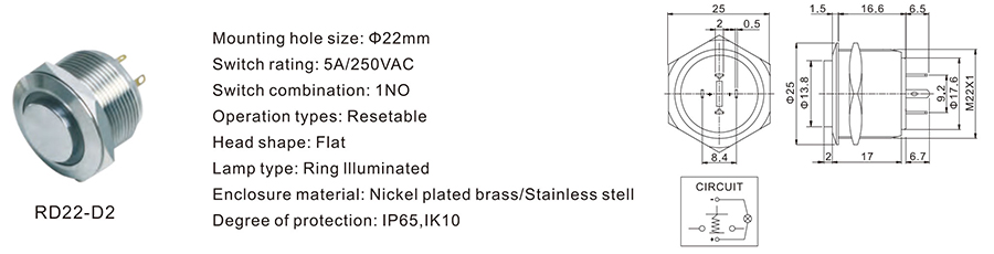 金屬開關 | RD22-G2 | 250VDC | 5A | / | / | ≥100,000 CYCLES | 立即申請 | 下載 |