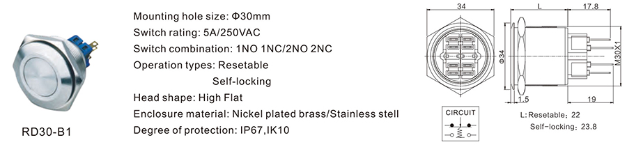 金屬開(kāi)關(guān) | RD30-B1 | 250VDC | 5A | / | / | ≥100,000 CYCLES | 立即申請(qǐng) | 下載 |