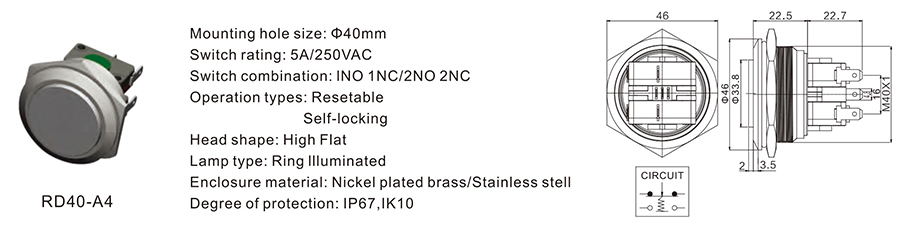 金屬開關(guān) | RD40-A4 | 250VDC | 5A | / | / | ≥100,000 CYCLES | 立即申請(qǐng) | 下載 |