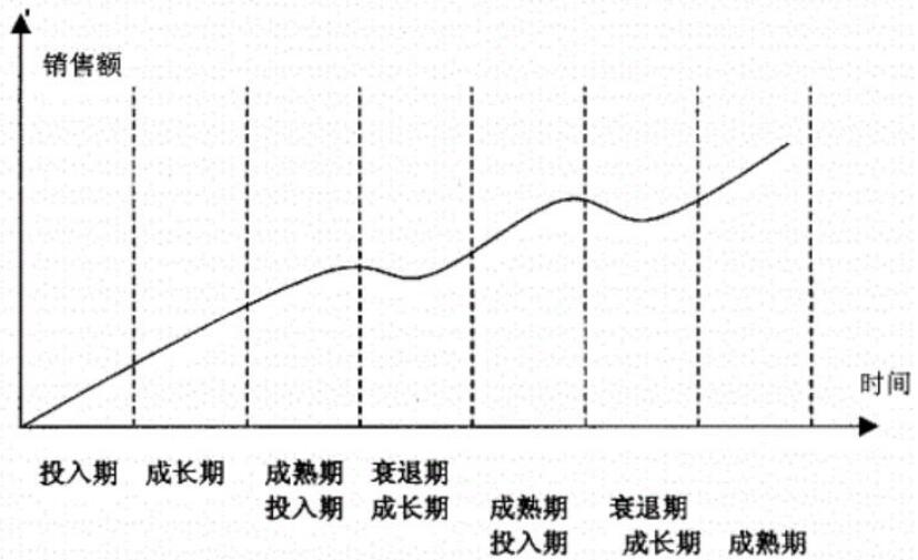 一般情況下在相對低端產(chǎn)品處于成熟期的階段,就會有廠商推出相對高端的產(chǎn)品。這樣就推動了產(chǎn)品的更新?lián)Q代,又帶來-輪新的產(chǎn)品生命周期。見圖1-2。
