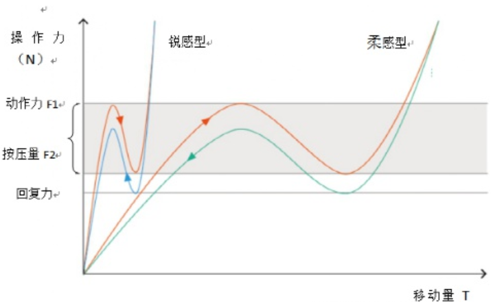 在同一操作力情況下,行程長時(shí)觸感柔軟順滑,行程短時(shí)觸感敏銳迅捷。即使是同一行程,按壓率發(fā)生變化時(shí)手指感受到的觸感也會發(fā)生變化(普遍認(rèn)為40%~60%為佳)。