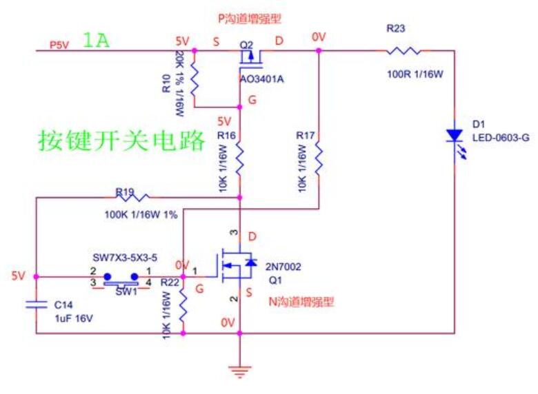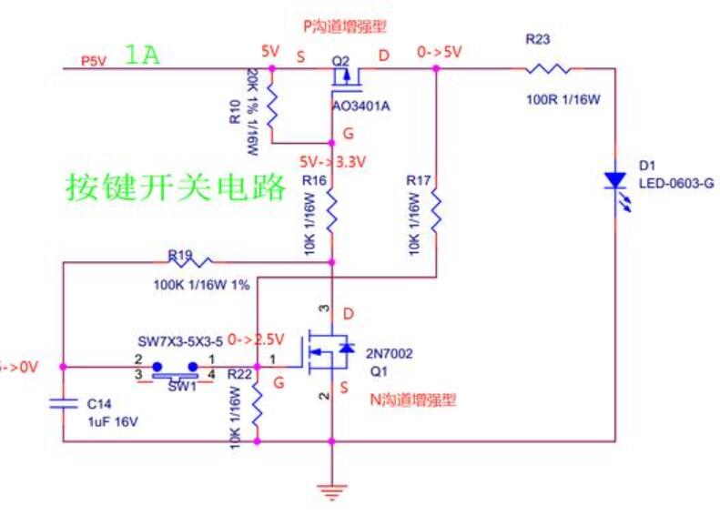 開關(guān)按鍵按下時,Q1的G點電壓瞬間拉高到5V(C14通過SW放電),然后再被拉回2.5V(由于R17,R22分壓作用),GS電壓2.5V達(dá)到閾值電壓,DS導(dǎo)通。由于R10和R16的分壓作用,Q2的G點電壓為3.3V,GS電壓為-1.7V達(dá)到閾值電壓,DS導(dǎo)通,輸出5V,LED燈亮。C14通過R19->Q1->DS放電,電壓為0