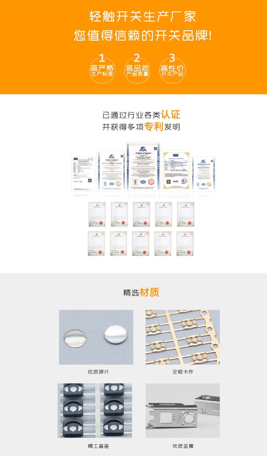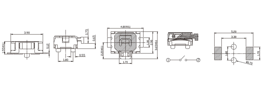 輕觸開關(guān)由:嵌件、基座、彈片、按鈕、蓋板組成其中防水類輕觸開關(guān)在彈片上加一層聚酰亞胺薄膜,輕觸開關(guān)有接觸電阻荷小、精確的操作力誤差、規(guī)格多樣化等方面的優(yōu)勢(shì)。