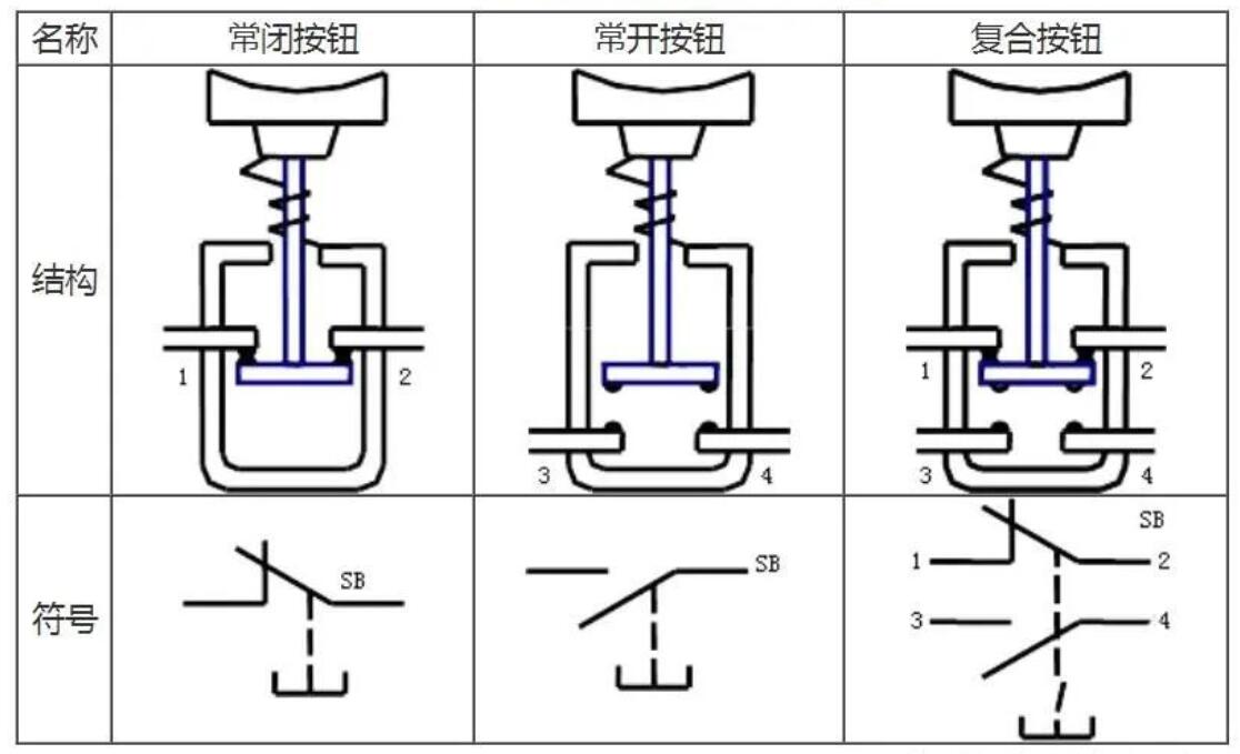 圖1所示的是一種按鈕的外形與剖面圖。按鈕的符號(hào)如表1所示。對(duì)于復(fù)合按鈕,將按鈕帽按下時(shí),下面一對(duì)原來(lái)斷開(kāi)的靜觸點(diǎn)被動(dòng)觸點(diǎn)接通,以接通某一控制電路;而上面一對(duì)靜觸點(diǎn)則被斷開(kāi),以斷開(kāi)另一控制電路。可以簡(jiǎn)單總結(jié)起動(dòng)作過(guò)程:按下先斷“1”“2”后合“3”“4”,松開(kāi)先斷“3”“4”后合“1”“2”。