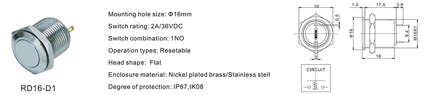 金屬開關(guān) | RD16-D4 | 36VDC | 2A | / | / | ≥100,000 CYCLES | 立即申請 | 下載 |