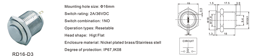 金屬開關 | RD16-D3 | 36VDC | 2A | / | / | ≥100,000 CYCLES | 立即申請 | 下載 |