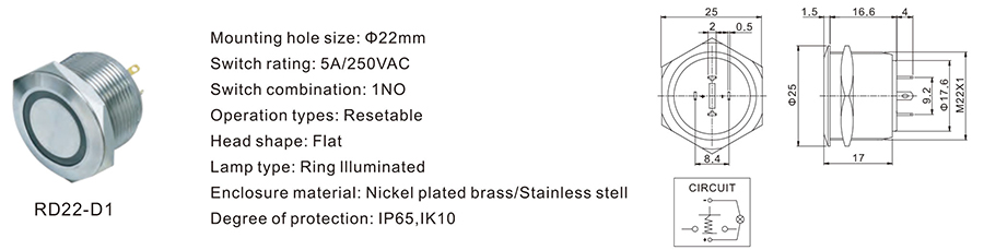 22MM金屬開關(guān)RD22-G1 金屬開關(guān) RD22-G1 250VDC 5A / / ≥100,000 CYCLES 立即申請 下載