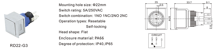 金屬開關(guān) | RD22-G3 | 250VDC | 5A | / | / | ≥100,000 CYCLES | 立即申請 | 下載 |