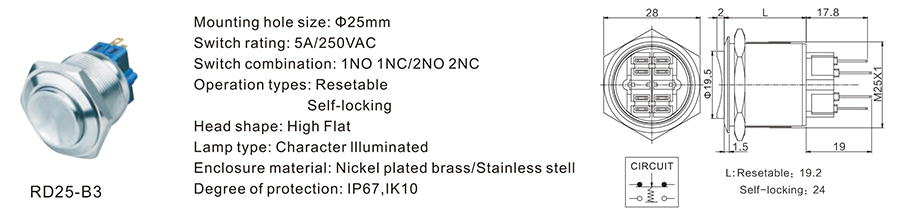 金屬開關(guān) | RD25-B3 | 250VDC | 5A | / | / | ≥100,000 CYCLES | 立即申請 | 下載 |