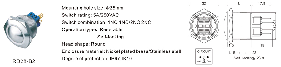 金屬開關(guān) | RD28-B2 | 250VDC | 5A | / | / | ≥100,000 CYCLES | 立即申請(qǐng) | 下載 |