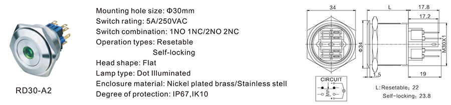 30MM金屬開關RD30-A2 金屬開關 RD30-A2 250VDC 5A / / ≥100,000 CYCLES 立即申請 下載