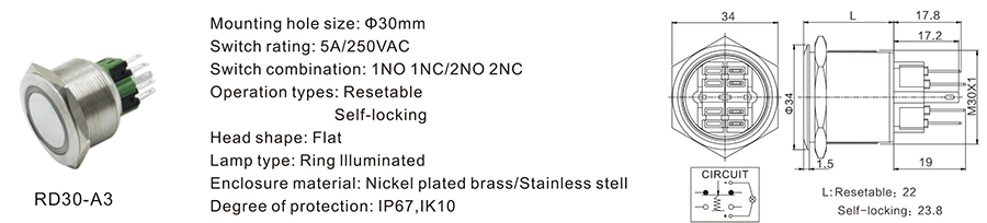 金屬開關(guān) | RD30-B3 | 250VDC | 5A | / | / | ≥100,000 CYCLES | 立即申請 | 下載 |