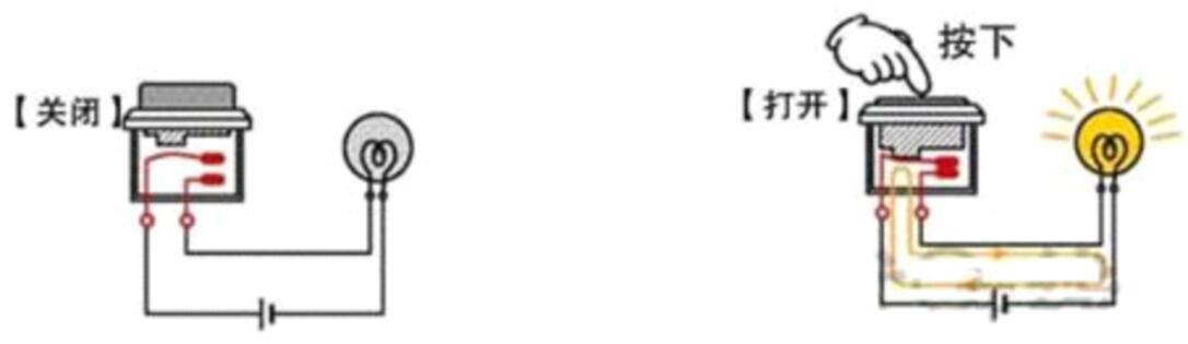a型觸點開關(guān)是指,沒有按下開關(guān)時候,兩個接觸點處于斷開狀態(tài),按下后變成導(dǎo)通狀態(tài)。想通過操作開關(guān)運(yùn)轉(zhuǎn)負(fù)荷(電燈或馬達(dá)等通過與電路連接消耗電氣能源的設(shè)備)時,使用a型觸點開關(guān)。下面介紹的電路就使用了a型觸點開關(guān),沒有按下開關(guān)時,燈是關(guān)著的,按下開關(guān)時燈被點亮(圖1)。