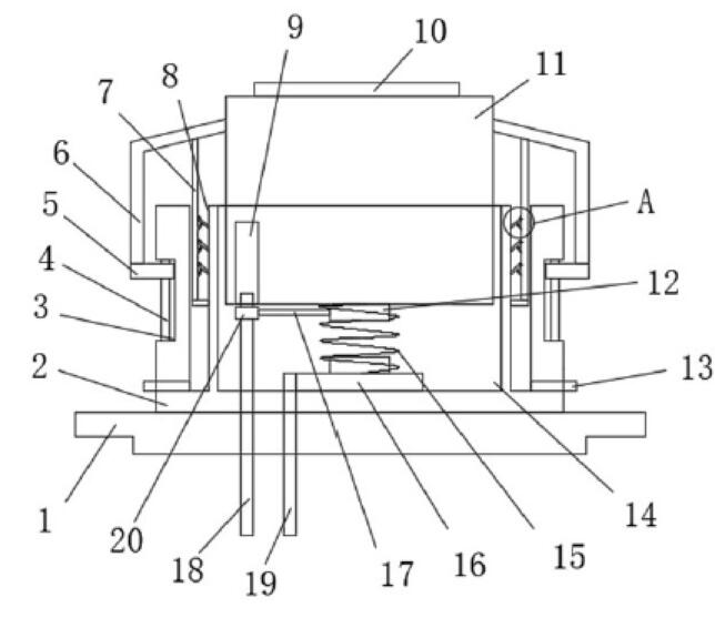 新型鍵盤開關的目的是為了解決現(xiàn)有技術中存在的缺點,而提出的防水防塵鍵盤開關,使用時通過底座將該開關安裝于鍵盤上,將第一插針和第二插針分別焊接在鍵盤的PCB上,通過手指按壓、松開按壓塊,使第一接觸片和第二接觸片接觸、分離,實現(xiàn)鍵盤輸入的功能,披水板可第一步阻止水進入開關內部,萬一水進入隔水槽,可通過排水管將水排出,隔水板可防止水進入開關內部,刮塵板可將隔水槽側壁上的灰塵刮下,避免灰塵進入開關內部。按壓塊的上端設有橡膠墊。隔水板位于隔水槽內的一端設有防塵網(wǎng),橡膠墊的表面設有防滑紋。排水管內填充有海綿。本實用新型結構簡單、操作便捷,實現(xiàn)鍵盤開關的防水和防塵功能,值得推廣。
