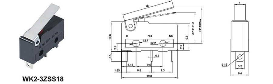 微動開關(guān)WK2-3ZSS18.3U 微動開關(guān) WK2-3ZSS18.3U 250VDC 5(2)A / / 1,000,000 cycles 立即申請 下載