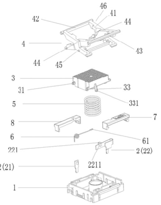 (6)通過在扭簧插槽上蓋合一大上蓋,在導(dǎo)通組件插槽上蓋合一小上蓋,起到防塵、及保護(hù)扭簧與導(dǎo)通組件的作用。